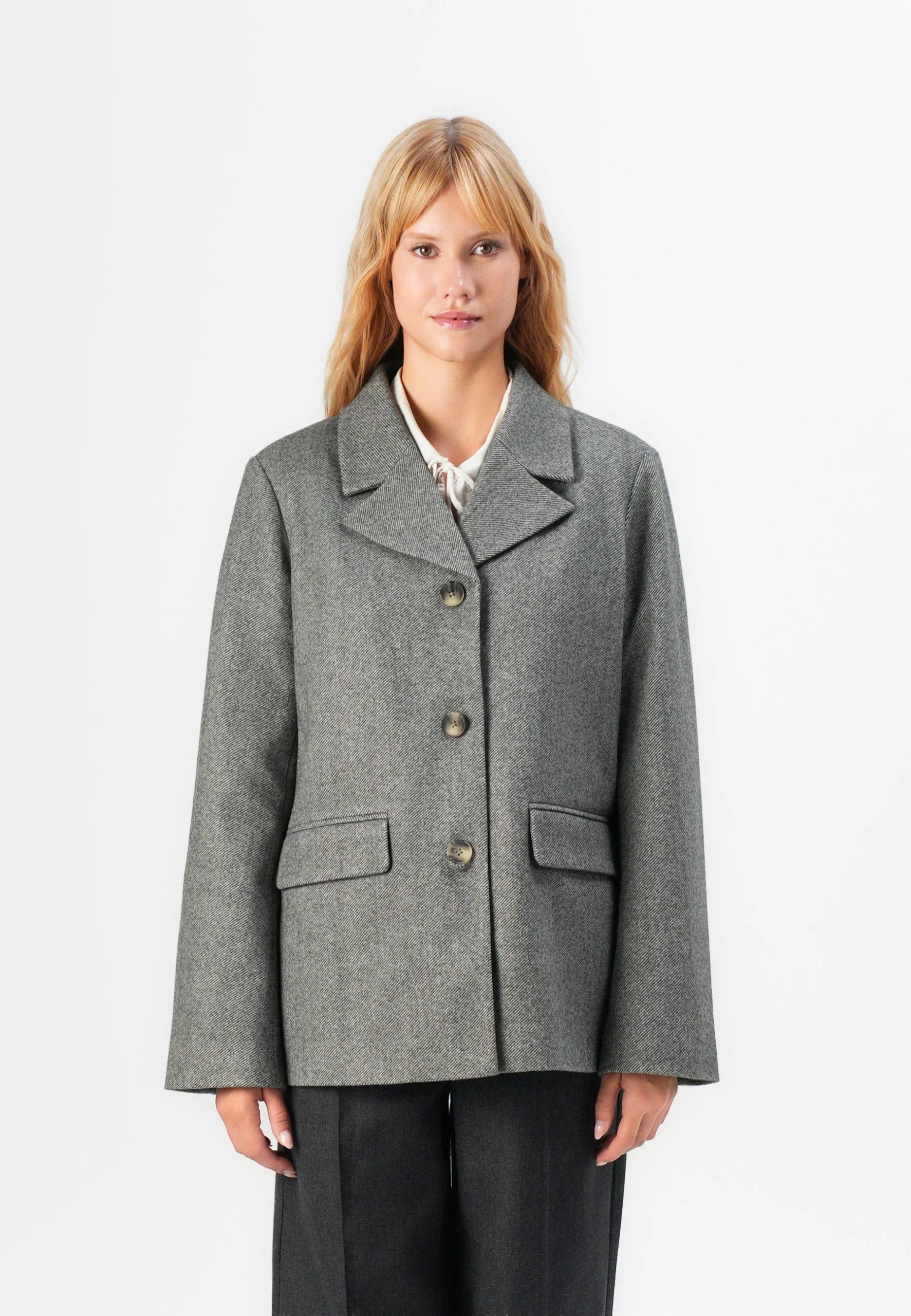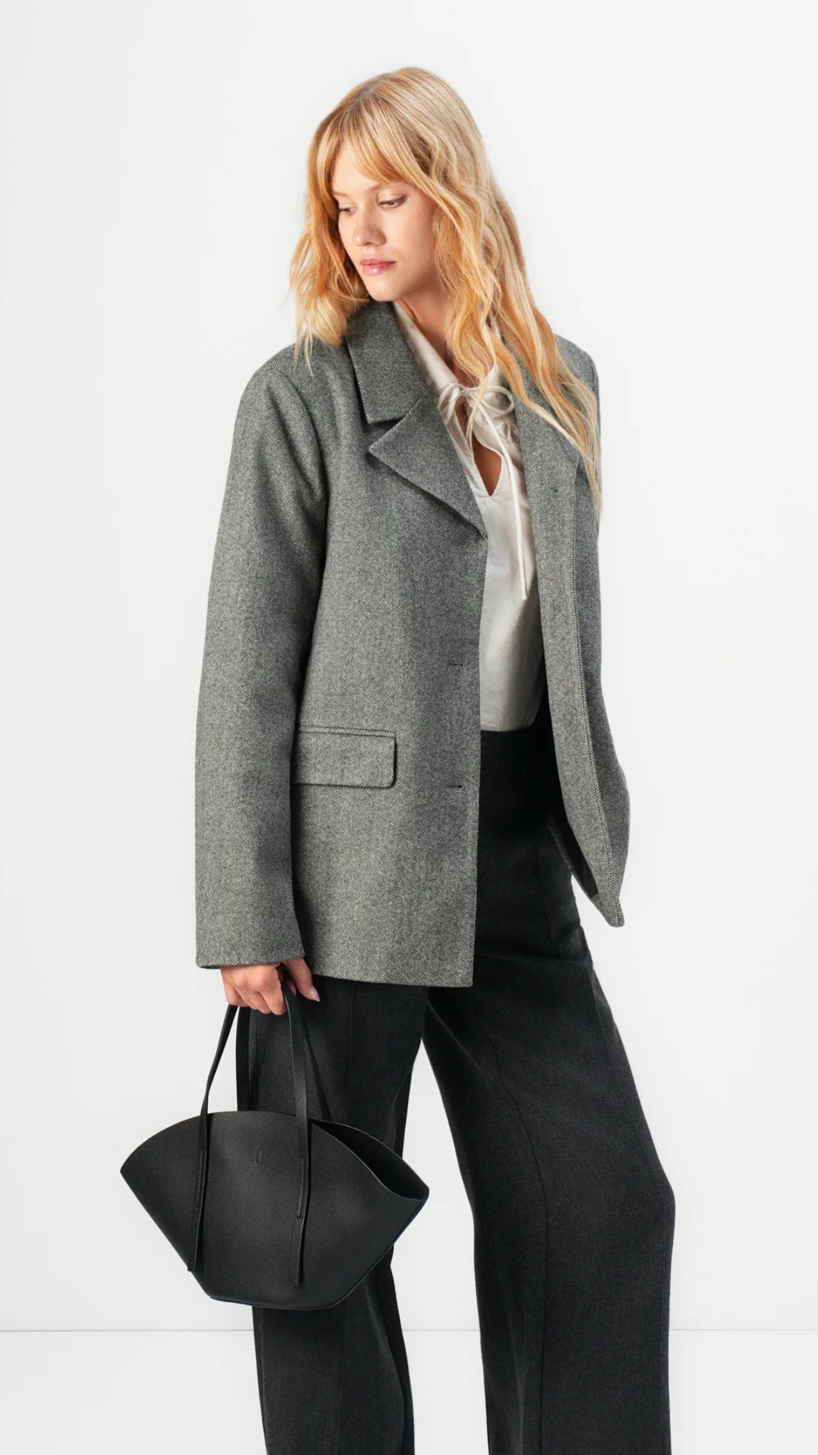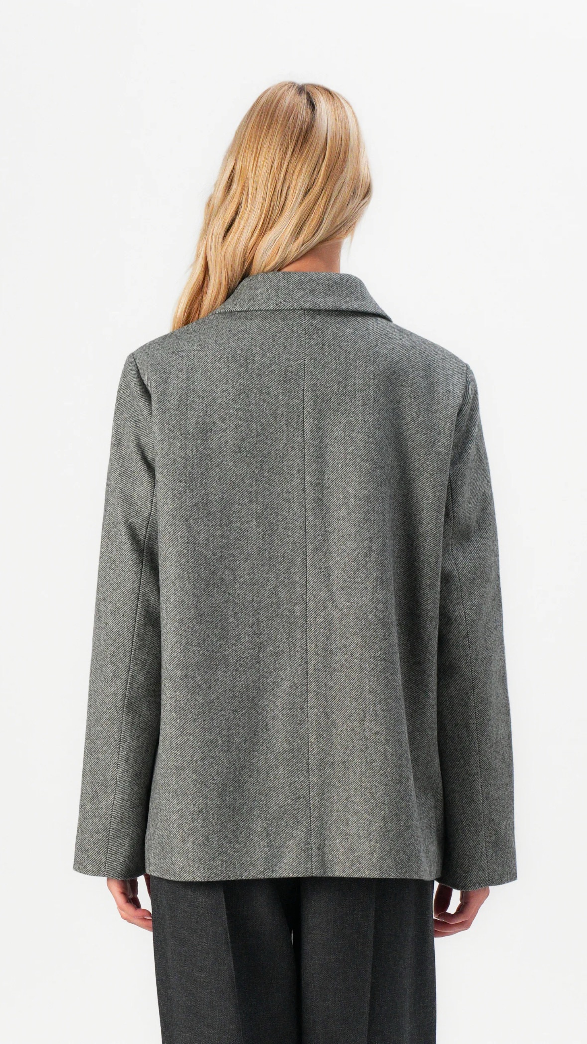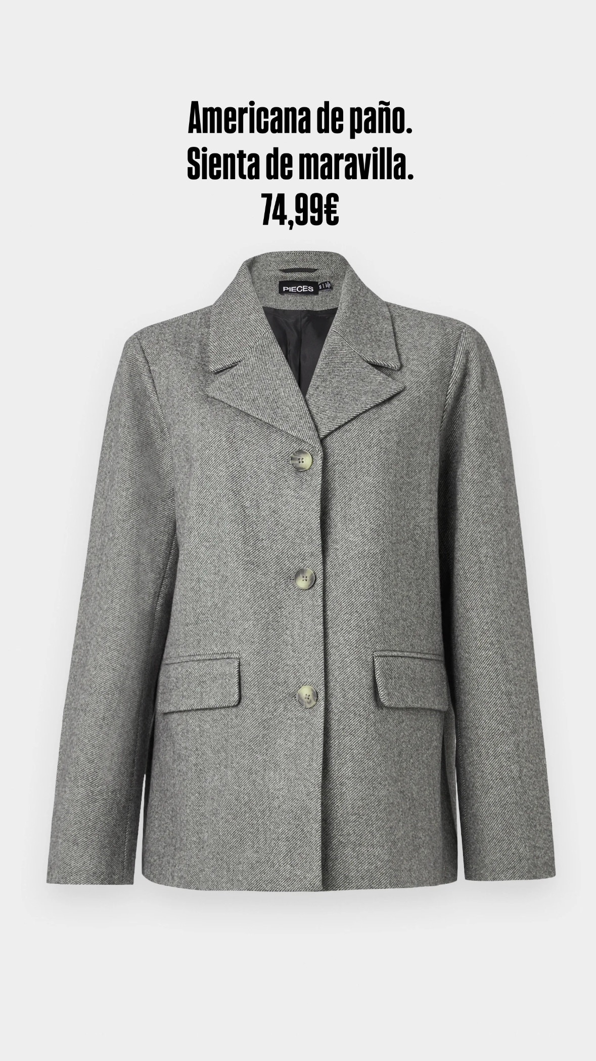 Abrigo de paño 100% poliester con forro interior, botones carey y patrón clásico.