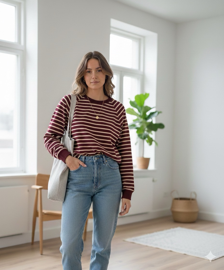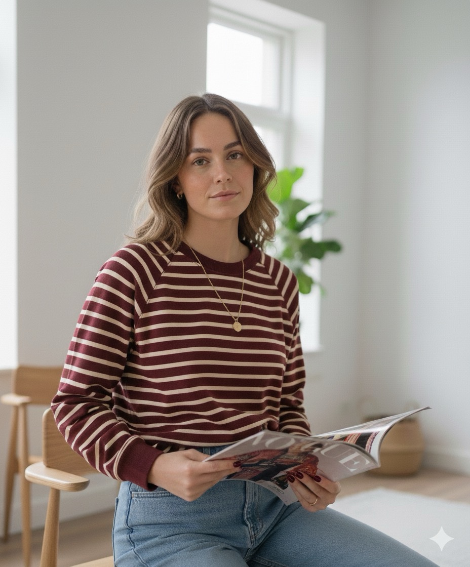 Sudadera 42% algodón. Fondo burdeos y rayita en color rosa palo. Manga ranglan. Tallaje amplio.