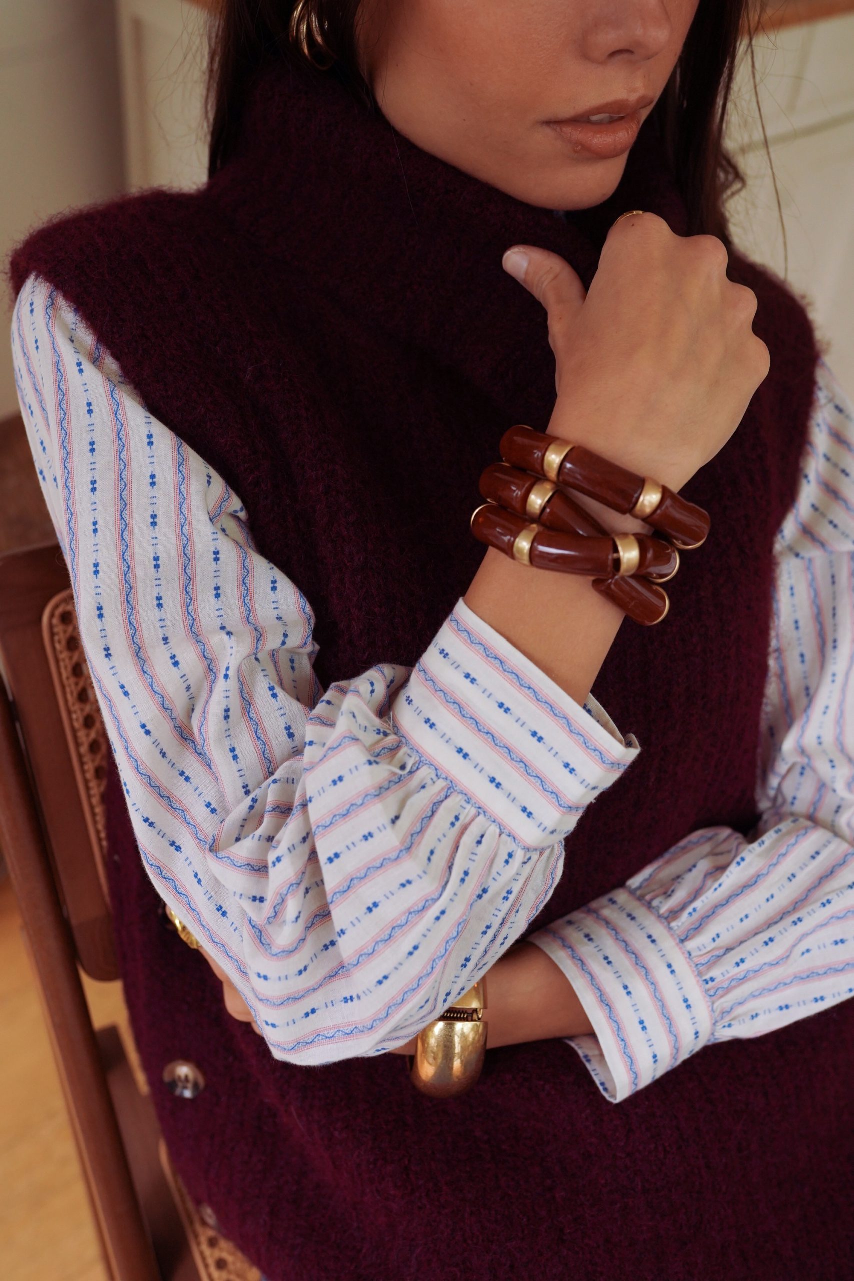 Camisa de algodón con detallesy bordados. Cuello maho semivictoriano. Botones carey. Tallaje amplio.