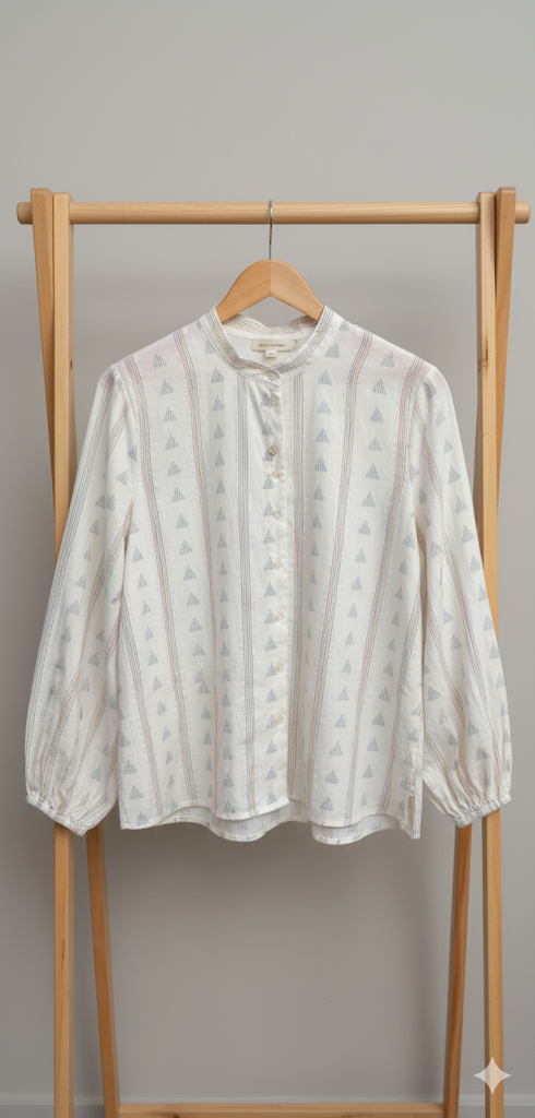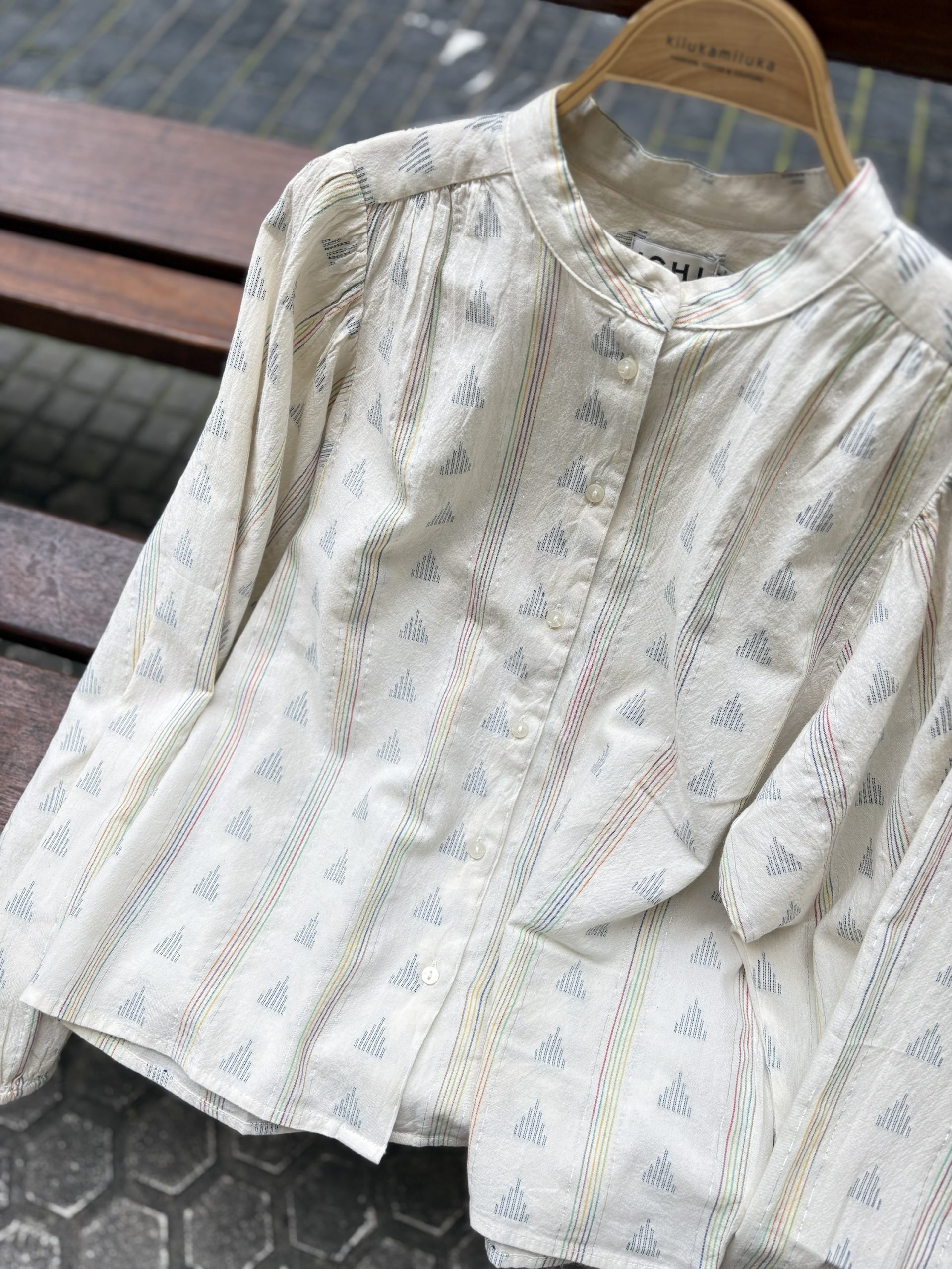 Camisa con cuello maho de algodón. Tejido super especial con rayitas de colores y lurex. Tallaje amplio.