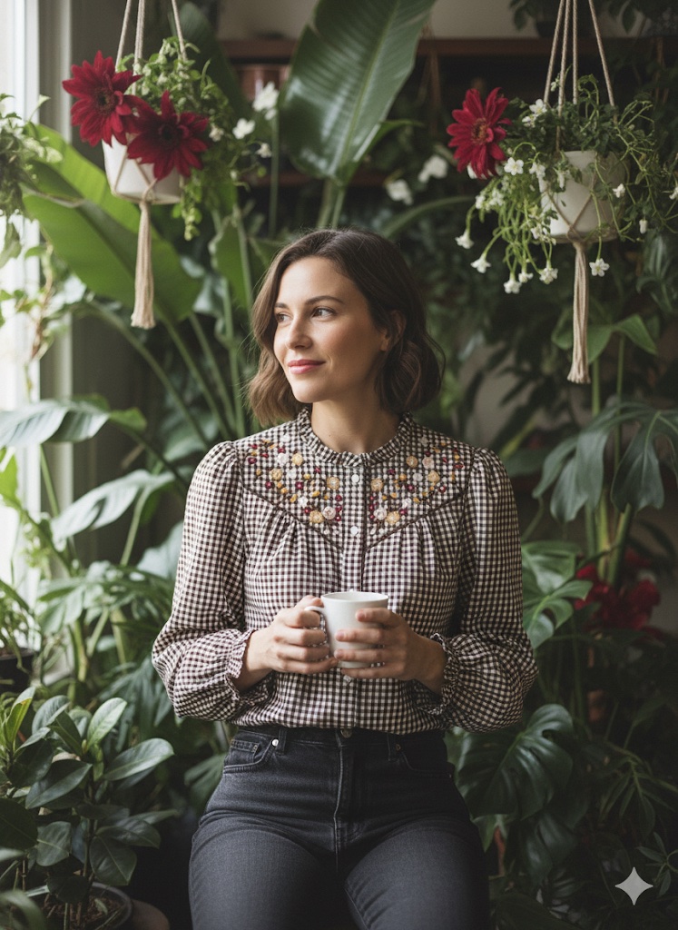 Camisa dd algodón con cuadro vichy en color marrón y bordados florales en el pecho. Tallaje normal.
