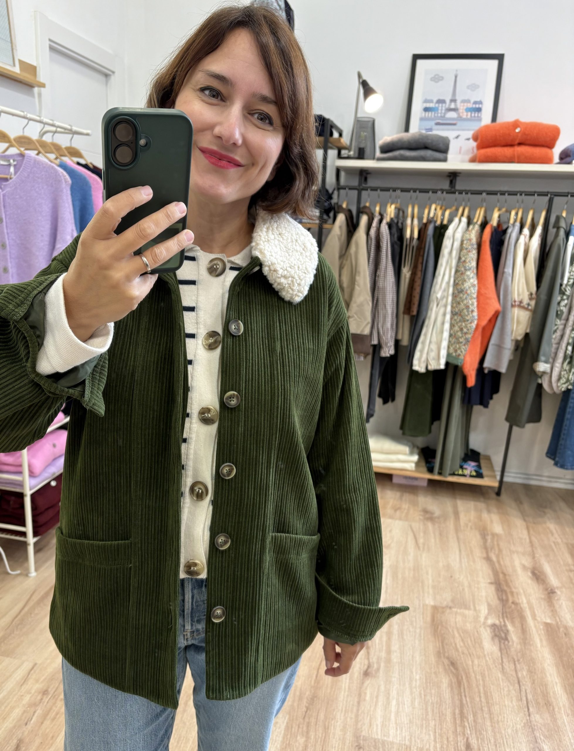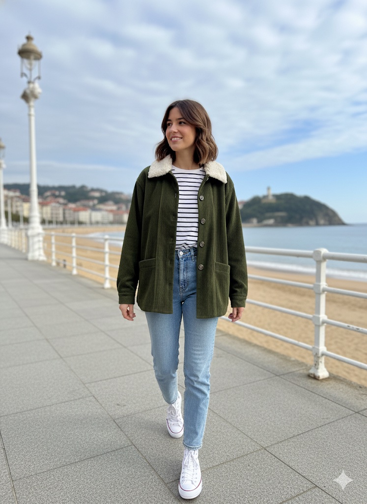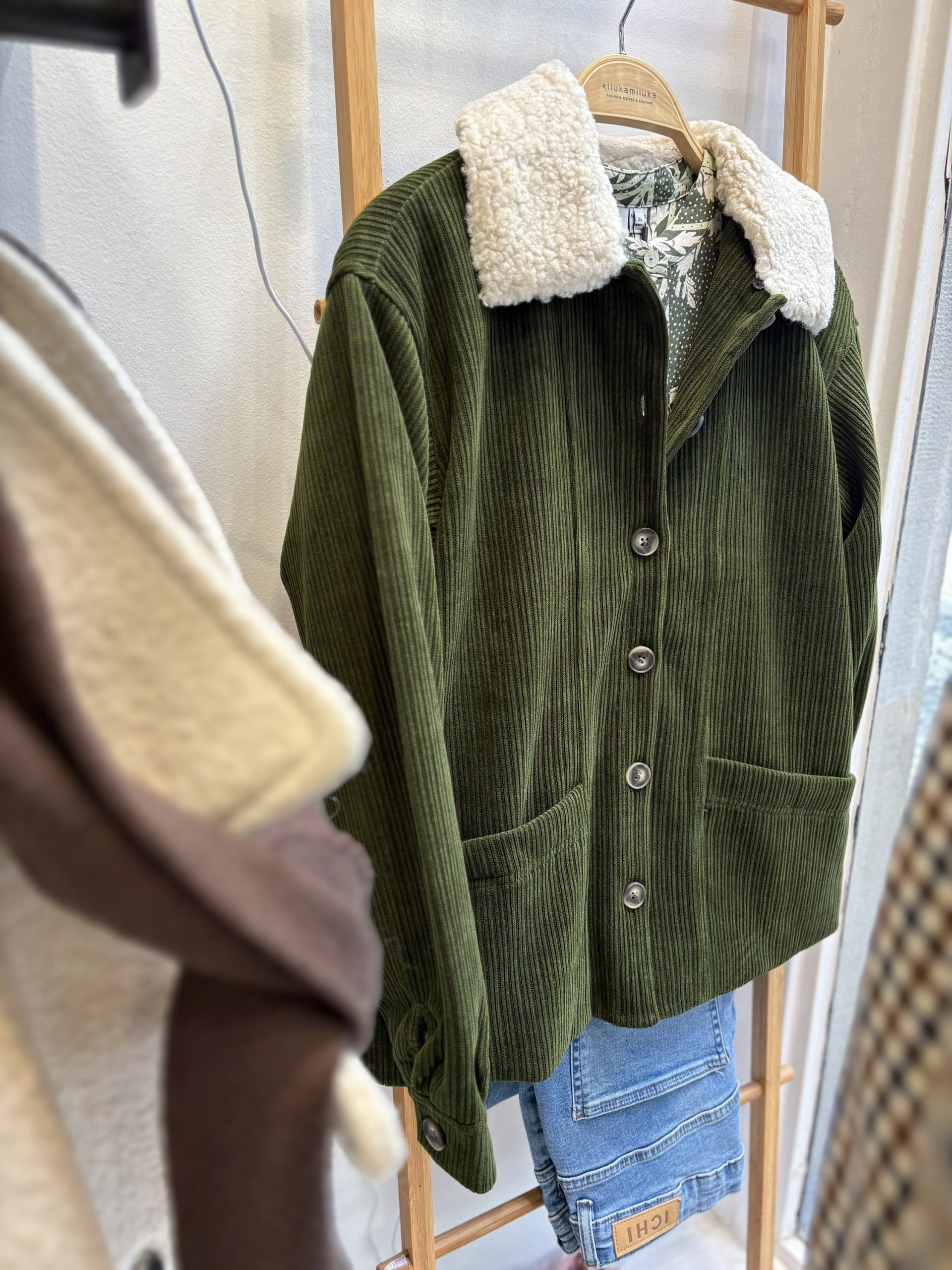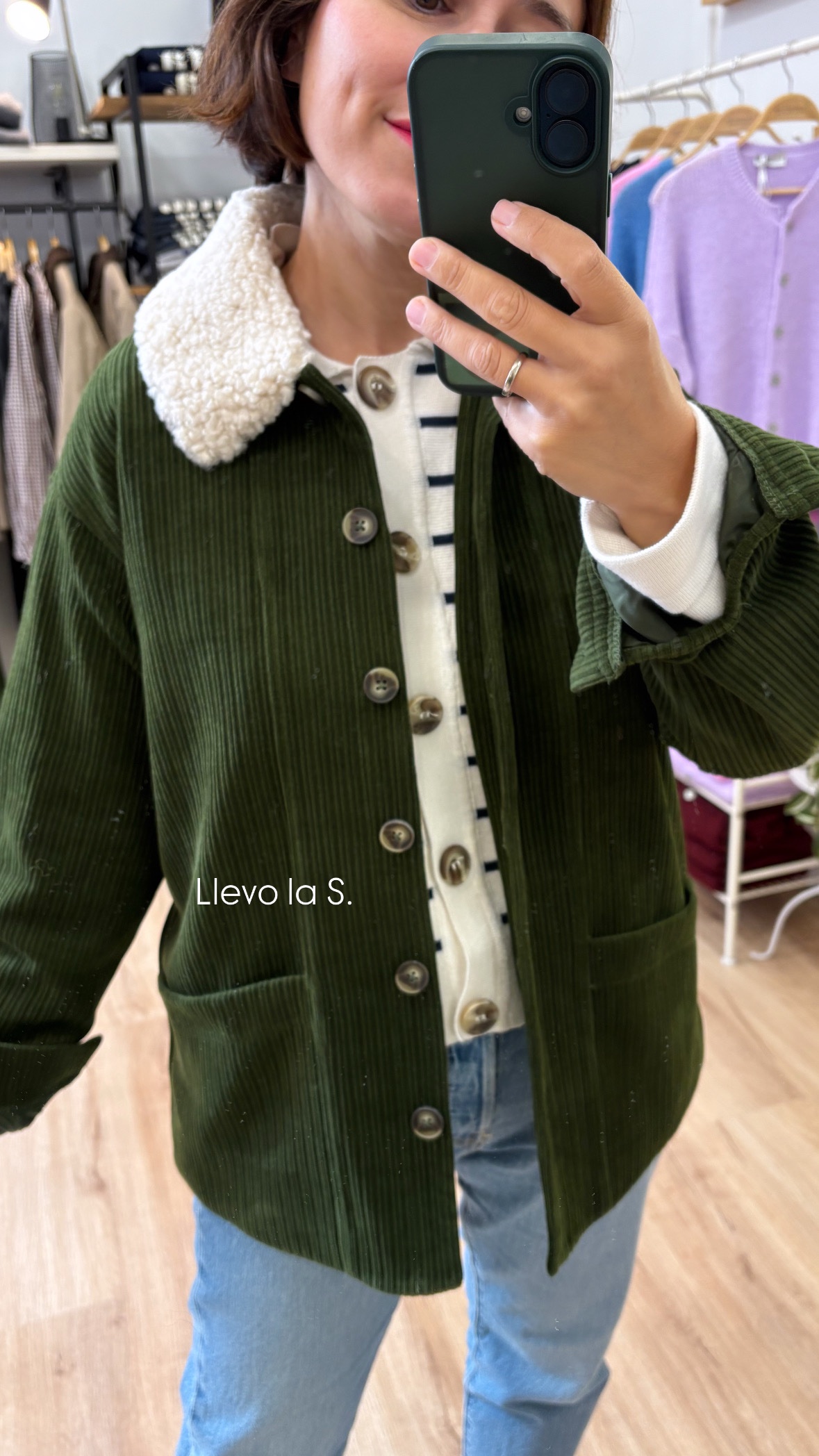 Cazadora de pana blandita y muy elástica con forro interior. Cuello de borrego extraíble. Tallaje amplio.