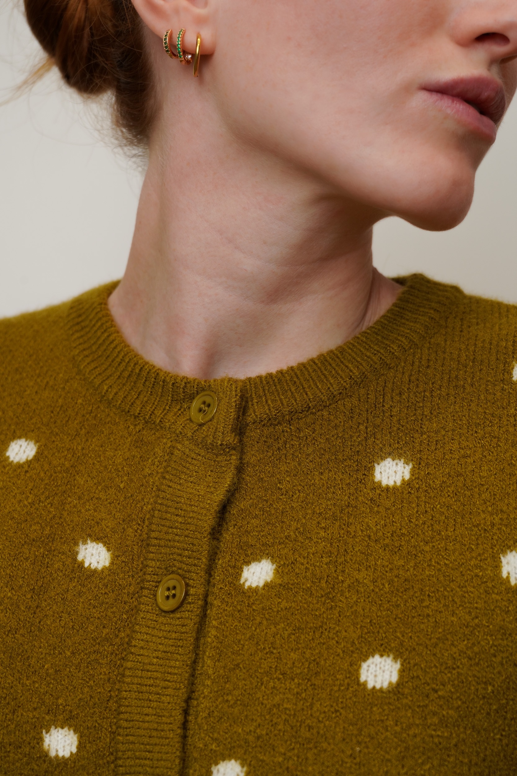 Chaqueta de punto de color oliva con topos blancos. Corte clásico y tallaje normal.