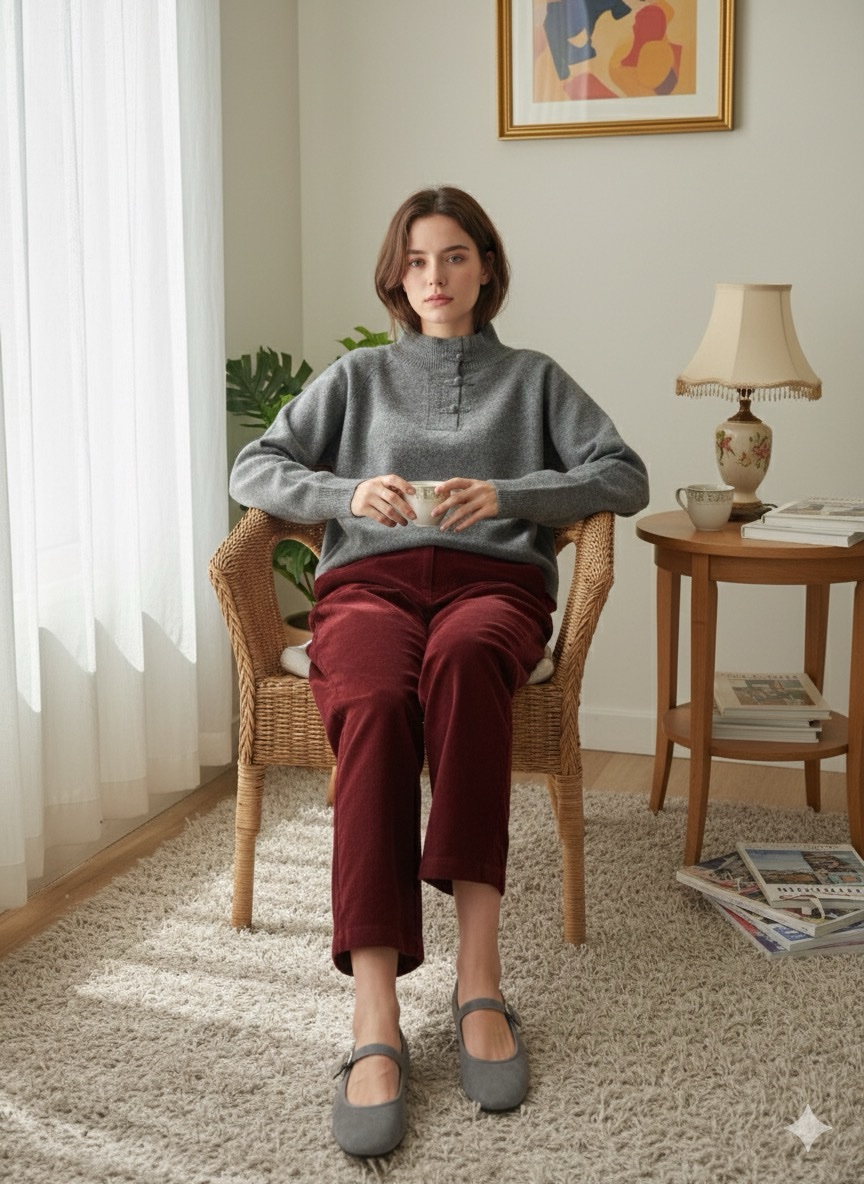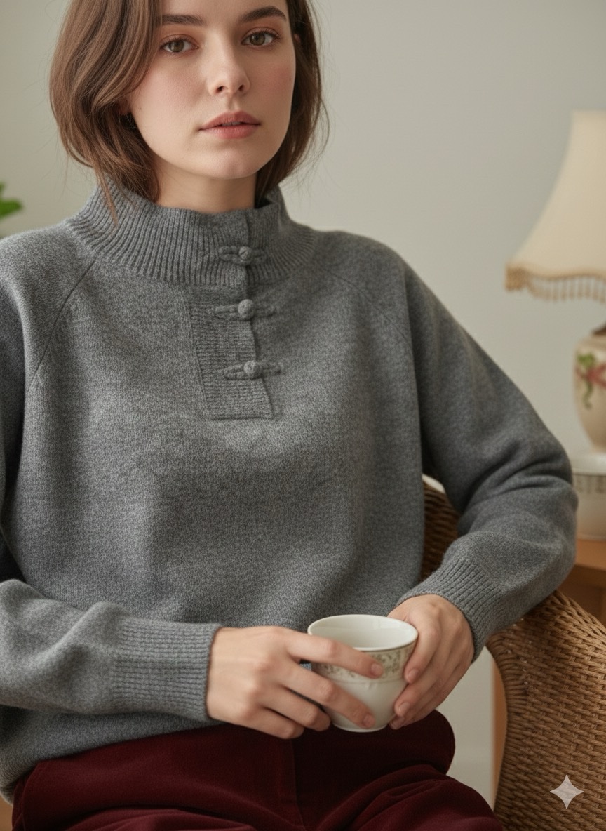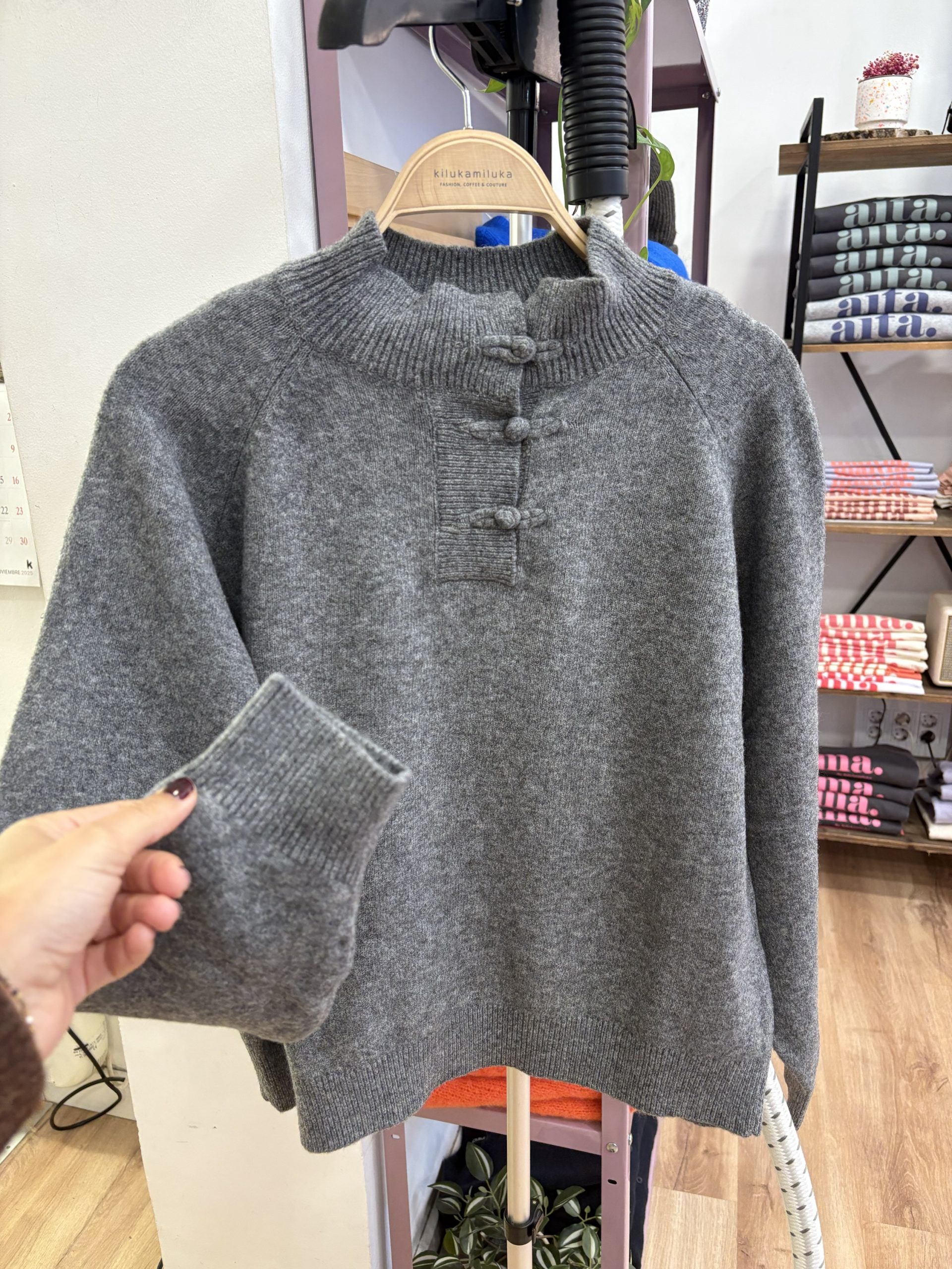 Jersey gris antrscita con cuello super especial de diseño nórdico. 9% de lana.