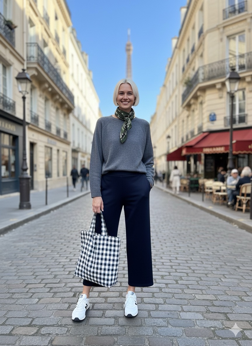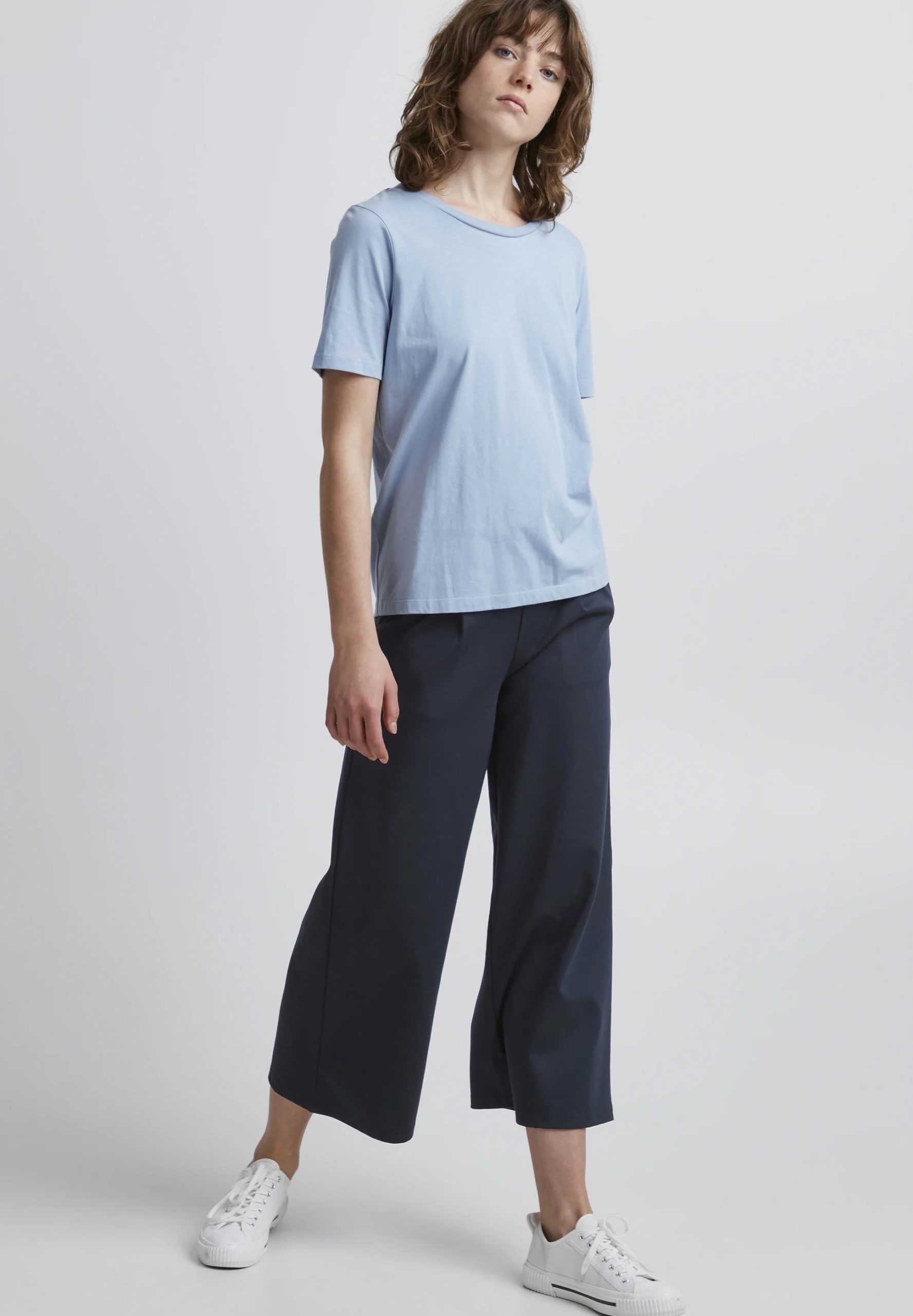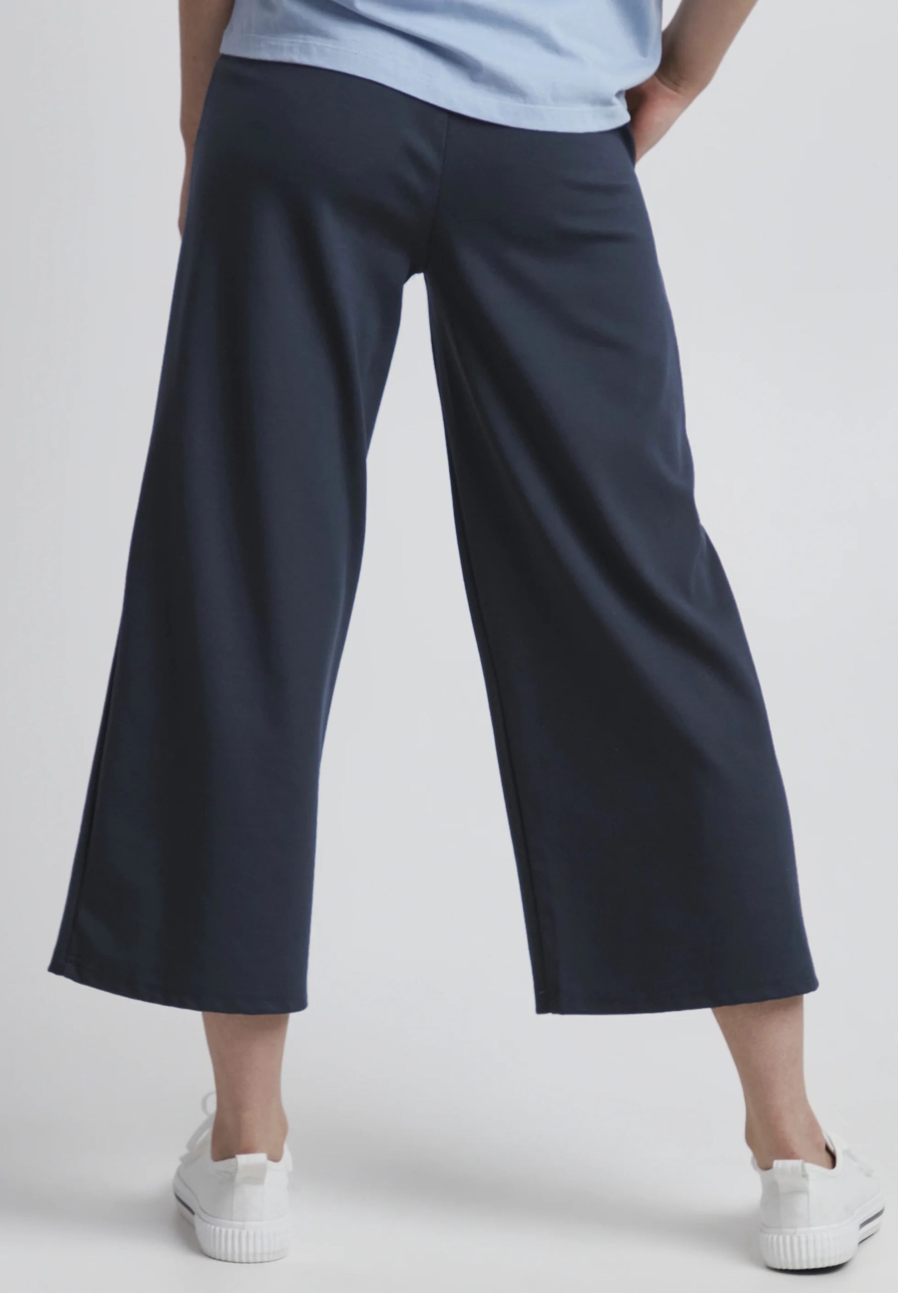 Pantalón de punto de algodón con goma en la trasera de la cintura, bolsillos y pinzas. Corte ancho y tobillero (ancle lenght). Para una 36 una S.