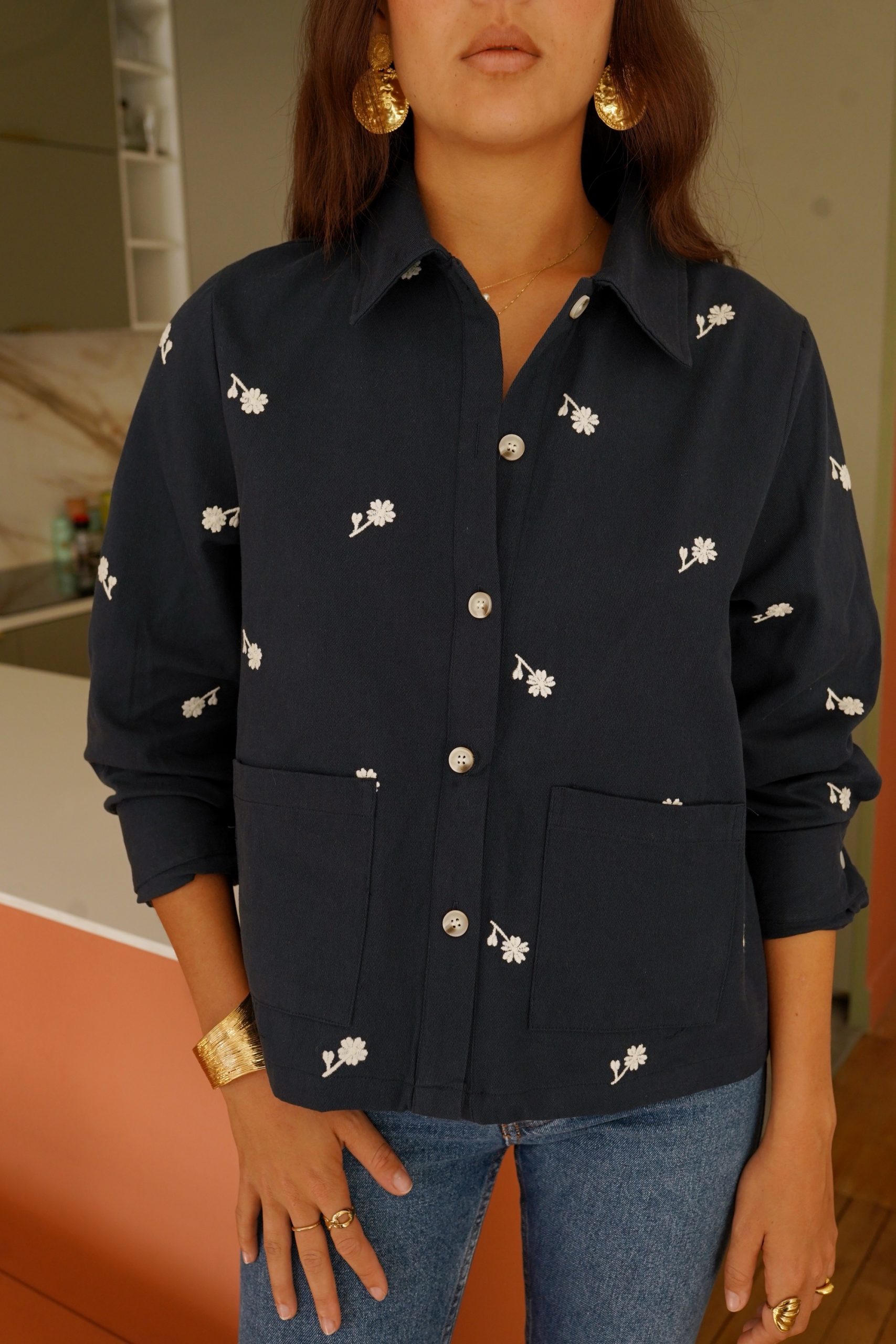 Camisa o sobrecamisa bordada en color azul marino. Patrón amplio para llevar con camiseta debajo o jersey fino, sudadera.. dales estilo a tus básicos!