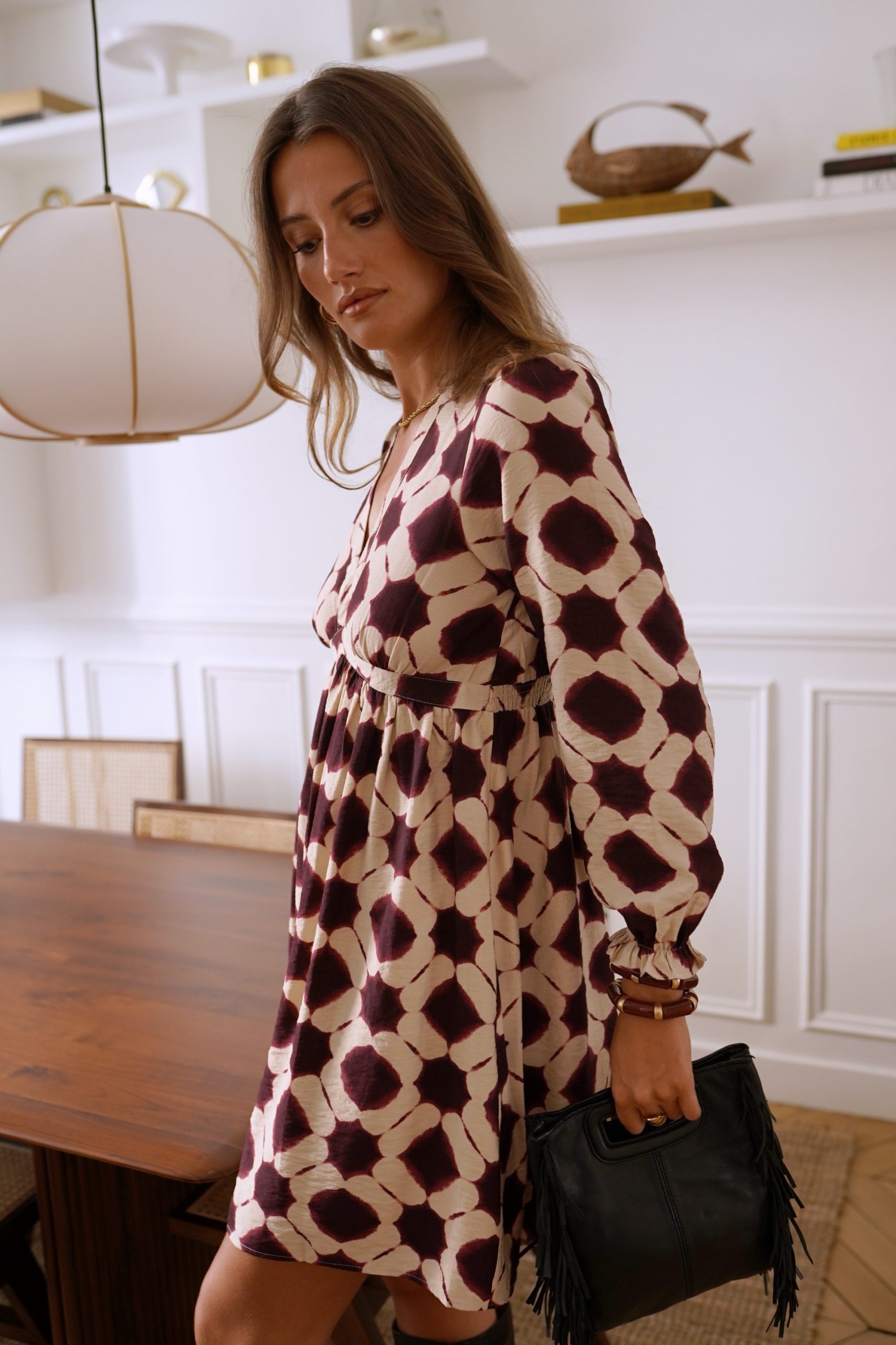 Vestido de estampado abstracto en tonos burdeos y tostados. Manga larga y escote ceñido. Tallaje normal.